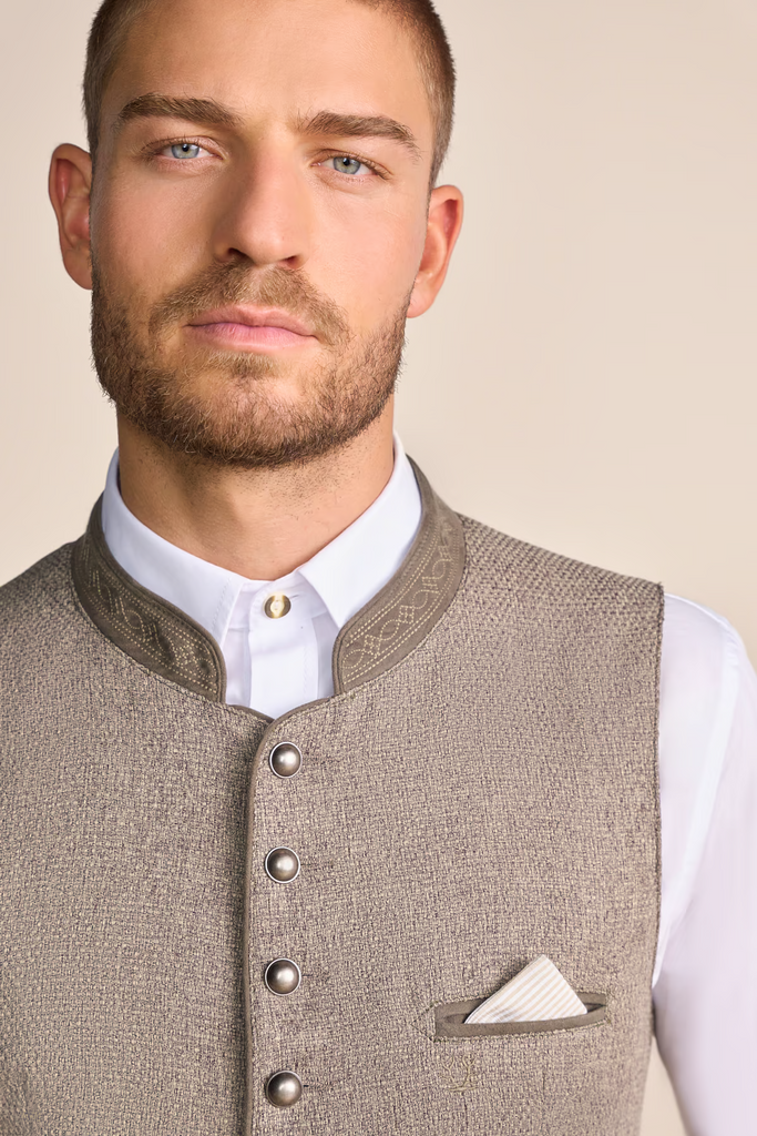 Unsere Trachtenweste Jörn verbindet einen zeitlosen und modernen Look auf elegante Art und Weise. Mit raffiniertem Rundhalsausschnitt und klassischer Knopfleiste mit edlen Knöpfen ist sie ein Hingucker. Feine Stickereien am Kragen setzen geschmackvolle Akzente. Perfekt geeignet für feierliche Anlässe oder als stilvolles Piece im Alltag, passend zu unseren modernen Trachtenhemden.
