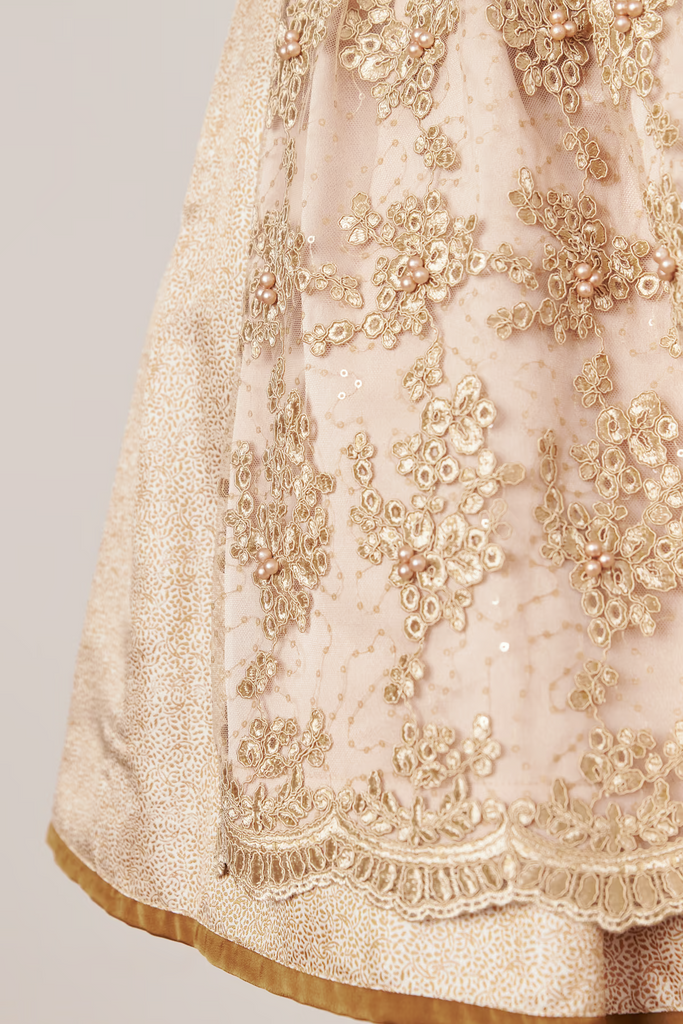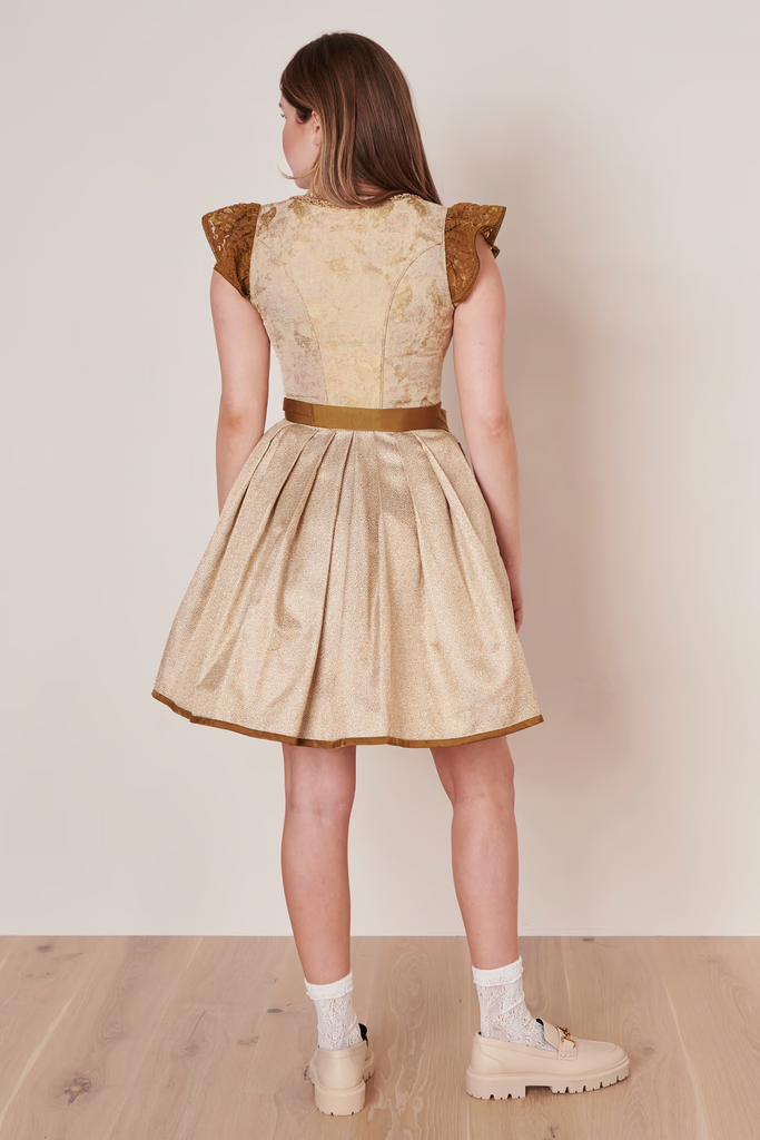 Durch die aufwendig mit Perlen bestickte Schürze wird das Dirndl Annabell zu einem Unikat. Die klassische Miederschnürung wurde bewusst reduziert, um einen modernen und reduzierten Look zu kreieren.