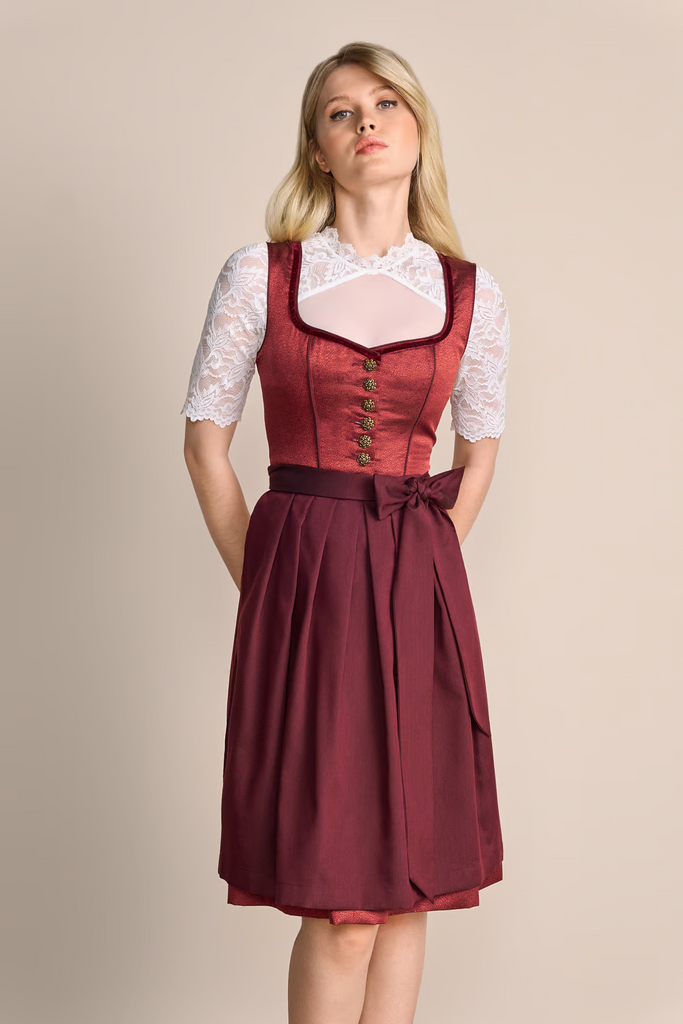 Unser Dirndl Mahita verzaubert mit traditionellem Look und dezenter Borte am klassischen Ausschnitt. Das fein schimmernde Streublumen-Mieder und dieselbe Musterung des Rockes formen eine elegante Silhouette. Schlichte Schürze und edle Knöpfe perfekt abgerundet! Das Dirndl passt zu einer reizvollen Dirndlbluse aus unserem großen Sortiment.