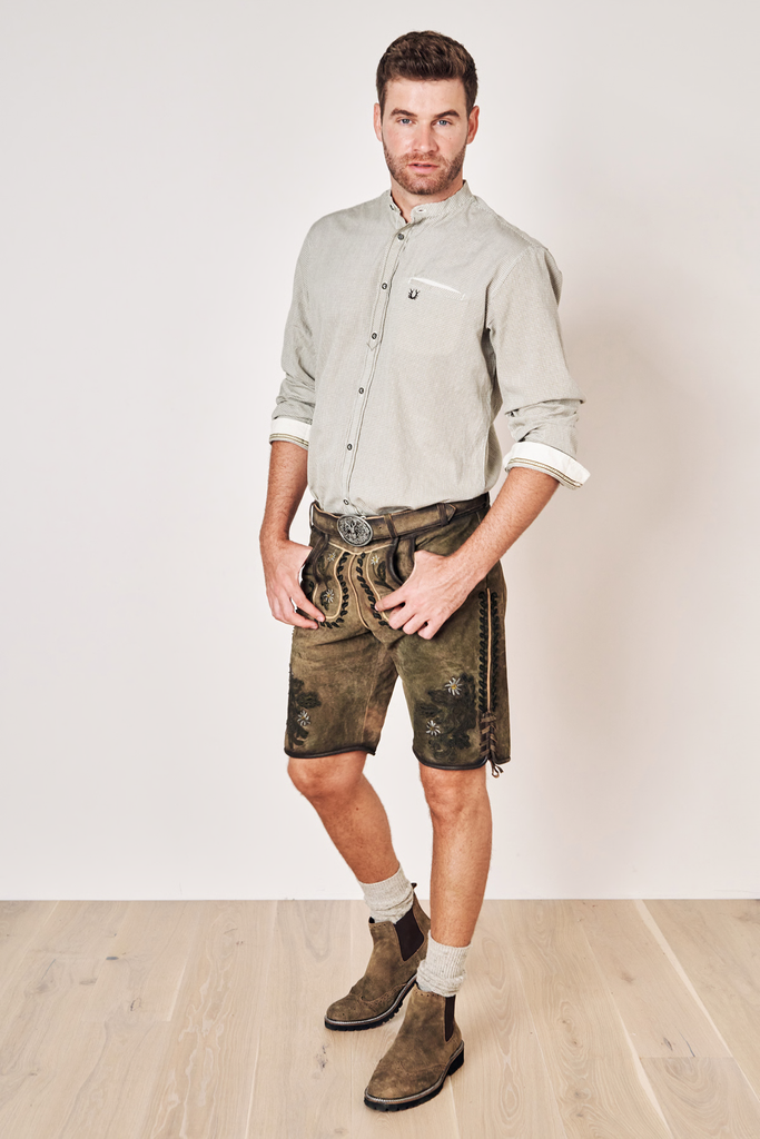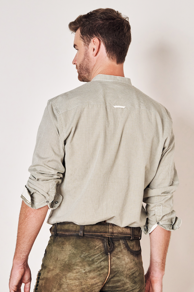 Das Trachtenhemd Collin verfügt über eine klassische Knopfleiste und einen modernen Stehkragen. Dank des Stehkragens kann das Hemd besonders gut unter einer Trachtenweste getragen werden. Die klassische Brusttasche ist perfekt geeignet für ein stylisches Einstecktuch.