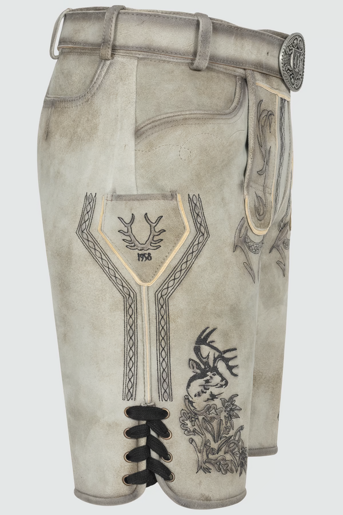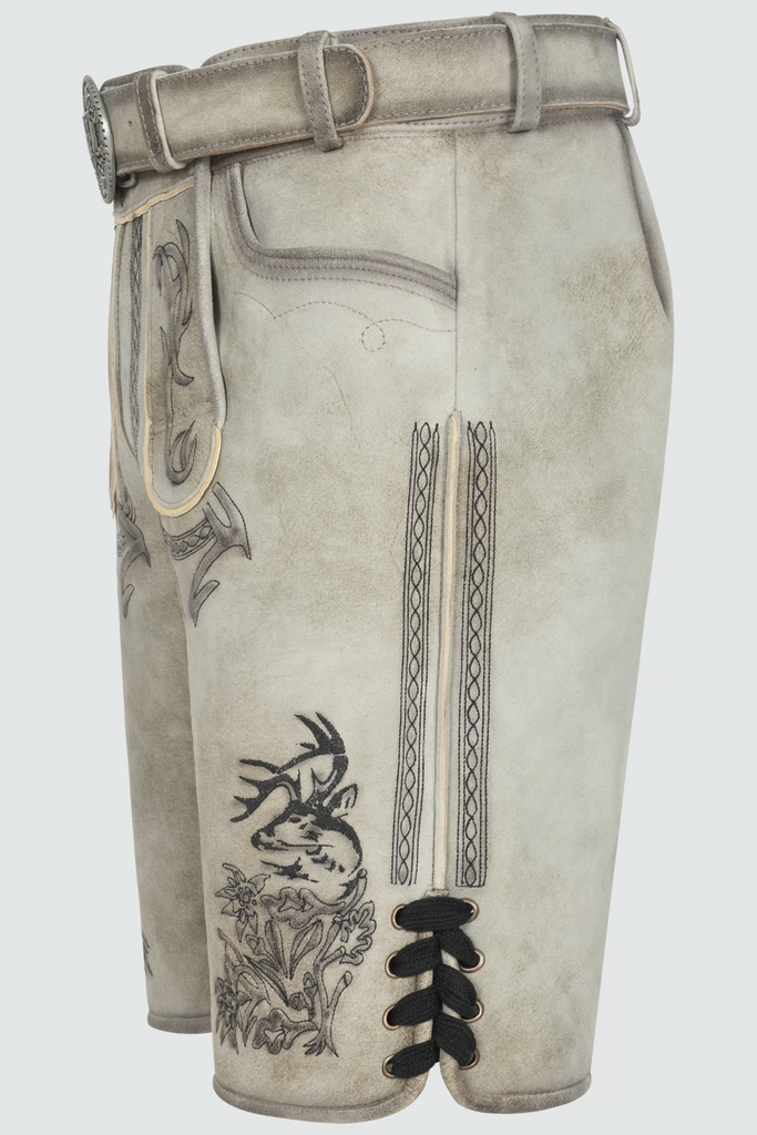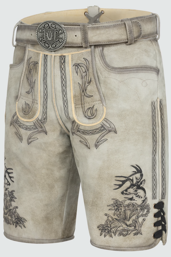 Entdecken Sie den perfekten Mix aus Traditionalität und Funktionalität mit unserer Herren Lederhose KAUI. Die prächtige Geweih-Stickerei auf dem Hosenbein und dem Latz verleiht deinem Look einen authentischen Touch, während der passende Gürtel mit dekorativer Schnalle und robusten Knöpfen für Langlebigkeit sorgen. Mit praktischen Taschen und aus hochwertigem Ziegenleder gefertigt, ist diese Lederhose ein stilvoller Begleiter für jede Gelegenheit. Super kombinierbar mit einem stylischen Hemd .