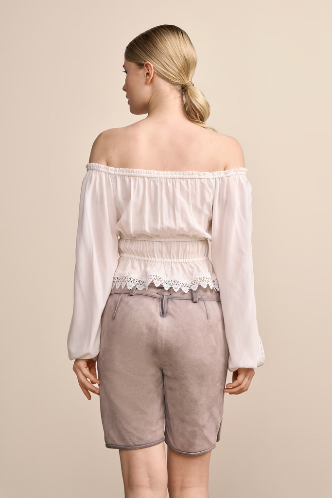 Unsere Bluse MOJA von Krüger Madl vereint klassische Eleganz mit verspielten Details. Edle Spitzen- und Raffungsdetails sorgen für eine feine Note und eine schmeichelhafte Silhouette. Mit Rundhalsausschnitt und langen Ärmeln ist sie perfekt für festliche Anlässe und stilvolle Trachtenoutfits. Passt auch super zu einer Lederhose .