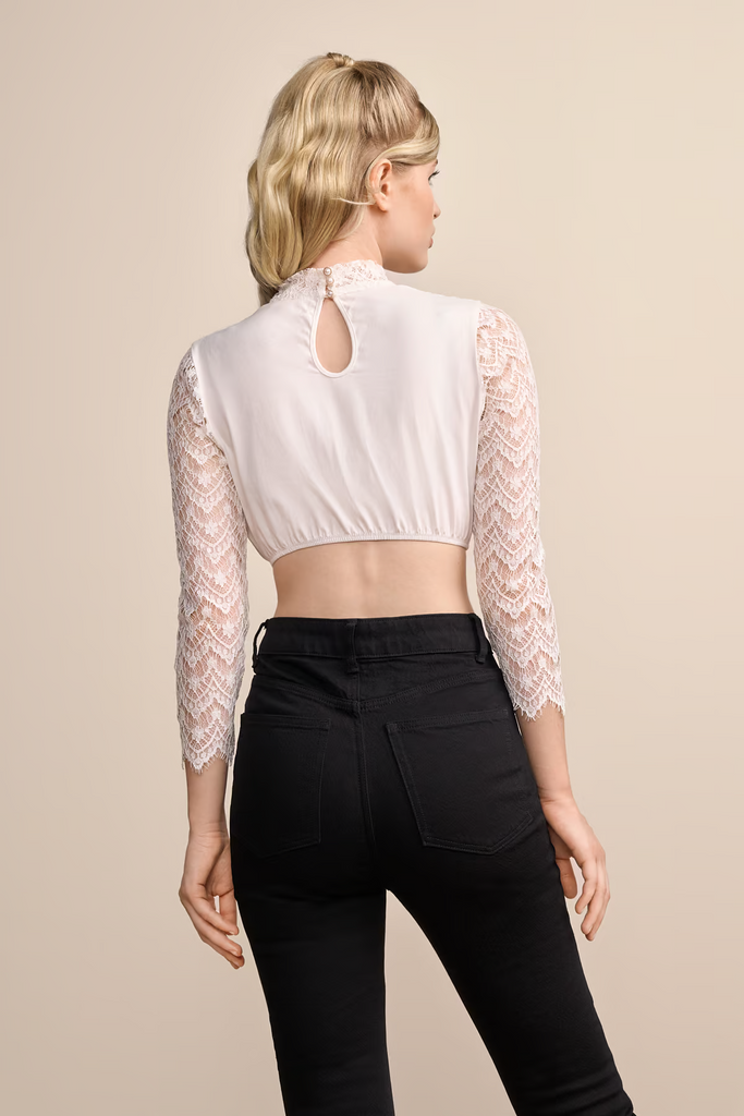 Unsere Dirndlbluse Dafina ist ein Traum aus hochwertiger Spitze. Mit ihren reizvollen Stickereien und dem hochgeschlossenen Ausschnitt ist sie der perfekte Blickfang für jedes traditionelle Outfit. Der ideale Begleiter für den nächsten Volksfestbesuch mit einem passenden Dirndl.