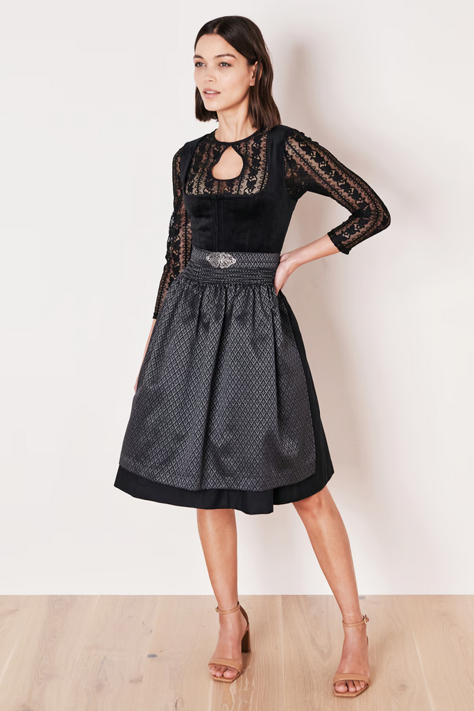 Entdecken Sie das elegante Samtdirndl ALISHA aus der MADL-Kollektion von Krüger. Das einfarbige Mieder mit geradem Ausschnitt verleiht dem Dirndl einen zeitlosen Charme. Die zarte Ornament-Musterschürze und die hübsche Schnalle sind echte Highlights. Mit Reißverschluss auf der Vorderseite und einer Länge von 60 cm ist es perfekt für Menschen mit Sinn für schönen Stil. Perfekt kombinierbar mit einer passenden Dirndlbluse aus unserem Sortiment.
