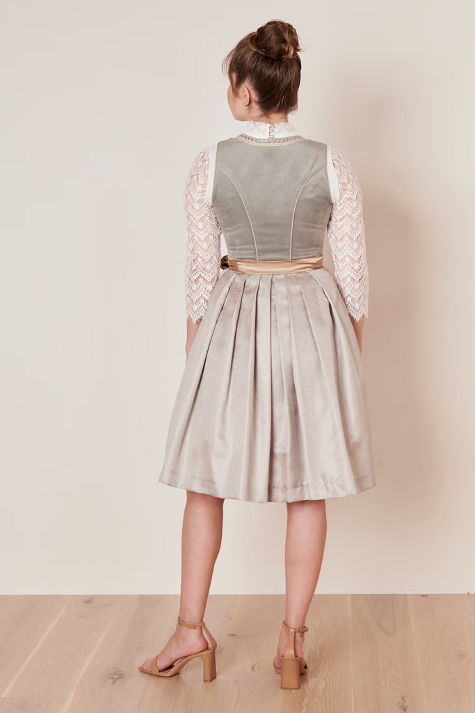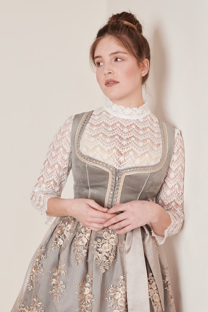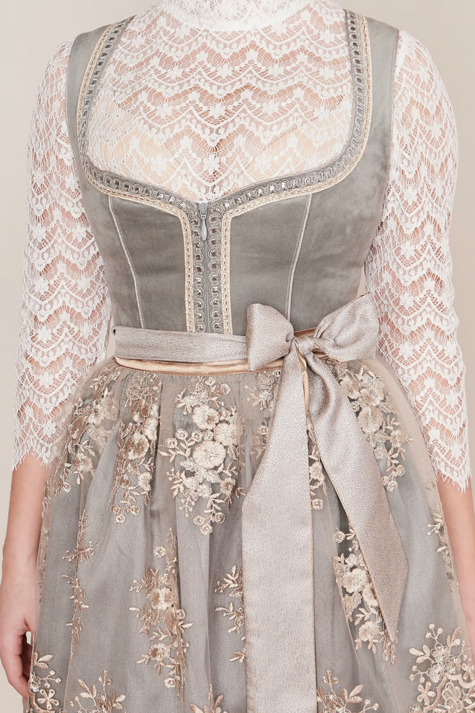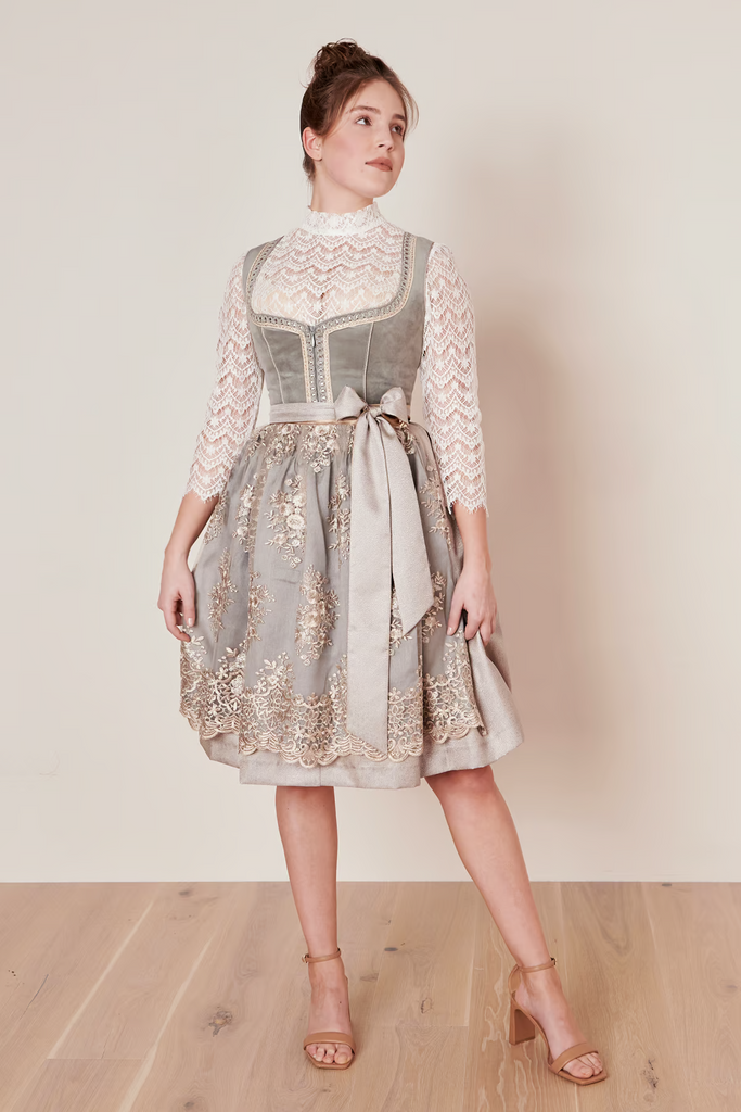 Erlebe den schlichten und eleganten Look des Dirndls Aurea. Mit seinem geraden Ausschnitt und der taillierten Passform ist dieses Dirndl ein subtiles Highlight. Nutze die praktischen Eingrifftaschen im Rock für kleine Essentials und genieße den Komfort des Reißverschlusses. Die bestickte Schürze und der ornamentale Rock verleihen dir eine elegante Note. Ein ärmelloses Design ermöglicht es, deine Lieblingsbluse zu präsentieren. Mit einer knielangen Länge von 60cm ist dieses MADL-Kollektion Dirndl perfekt für jeden Anlass. Die passende Dirndlbluse ist auch in unserem Online-Shop erhältlich!