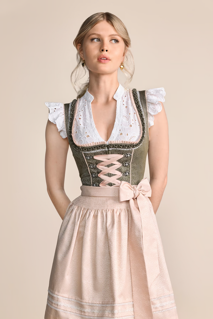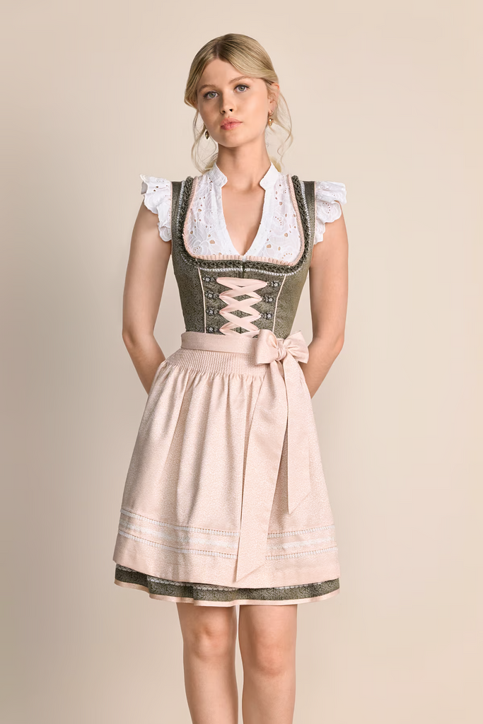 Das Dirndl ELOWEN von Krüger Madl ist ein elegantes, exklusives Dirndl mit einer Länge von 50 cm. Das olivgrüne Dirndl besticht durch seine faszinierende Farbkombination mit der zarten rosafarbenen Schürze. Die passende Dirndlbluse rundet das Gesamtbild ab und verleiht Ihnen eine stilvolle und luxuriöse Ausstrahlung.