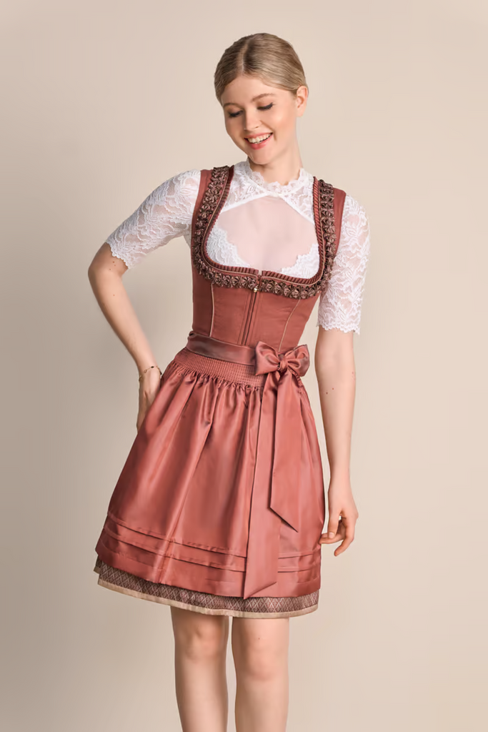 Unser schickes Dirndl Marielle vereint klassische Eleganz und Tradition. Der gerade Ausschnitt mit dekorativer Froschgoscherl-Borte und der interessante Diamantenmuster-Rock machen es zu einem Hingucker. Die schimmernde Schürze rundet das harmonische Gesamtoutfit ab. Ein Traum für alle Trachtenliebhaberinnen! Perfekt für einen unvergesslichen Auftritt mit einer passenden Dirndlbluse.