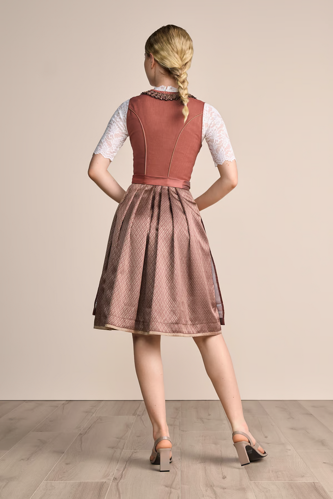 Unser schickes Dirndl Marielle ist der Traum für alle Tracht-Liebhaberinnen! Es vereint klassische Eleganz mit Tradition, dank romantischer Farben und traditionellen Schnitten. Der gerade Ausschnitt mit dekorativer Froschgoescherl-Borte und der interessante Diamantenmuster-Rock sind echte Hingucker. Die schimmernde Schürze rundet das harmonische Gesamtoutfit ab. Perfekt für alle Trachtenliebhaberinnen! Dazu eine reizende Dirndlbluse? Bei uns im Shop wirst du bestimmt fündig!