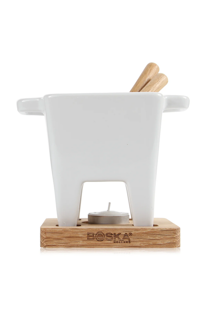 Mit diesem kompakten Fondueset aus Eichenholz von Boska wird jedes Käsefondue zu einem besonderen Erlebnis. Das hochwertige Untergestell aus europäischer Eiche kombiniert Funktionalität mit natürlicher Eleganz. Zum Set gehören zwei praktische Fonduegabeln, sodass du direkt loslegen kannst. Dank des Teelichts bleibt dein geschmolzener Käse stundenlang warm – für genussvolle Momente ohne Hektik!